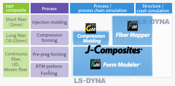 This is a software series that supports the process and process chain solution of J-Composites plastic/composite materials. The series includes stamping simulation Modeling tool "Form Modeler", compression forming analysis Modeling tool "Compression Molding" and the "Fiber Mapper" which maps the composite flow solution to the structured solution meshes.