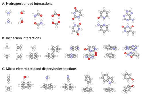 S22ベンチマークに含まれる22の分子性錯体の構造を示す図。水素結合、分散力、双極子相互作用など多様な相互作用を含む構造が視覚的に確認できる。