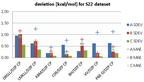 各汎関数による相互作用エネルギーと参照値との誤差を示す図。SDEVとMAEにより、汎関数ごとの精度が比較されている。