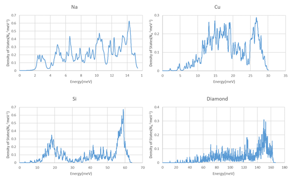 Na、Cu、Si、ダイヤモンドのフォノン状態密度を示す図。音響モードと光学モードの構成が異なり、状態数の違いが視覚的に確認できる。