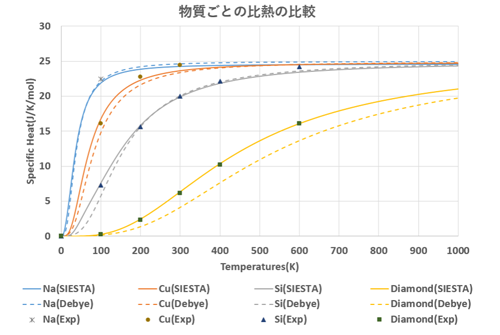 本事例では、Na、Cu、Si、ダイヤモンドの単原子固体に対して、SIESTAモデラのフォノン解析機能を用いてフォノン状態密度を算出し、格子比熱を評価した。定積モル比熱はフォノン状態密度とボーズ・アインシュタイン分布関数を用いて数値積分により求められ、Debyeモデルとの比較により物質ごとの特性が明らかとなった。