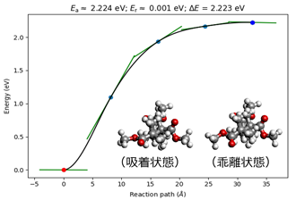吸着前後のエネルギー差は2.2eVで、分子間力と構造変化のエネルギーを含む。NEB計算により吸着過程のエネルギープロファイルが得られ、遷移状態は存在しないと判断された。