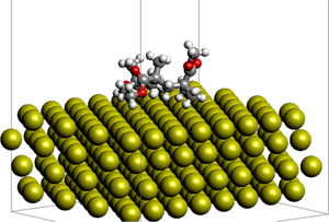 金(111)表面にPMMA三量体が付着した構造を示し、古典MDで作成された初期構造としてNEB計算に用いられた。