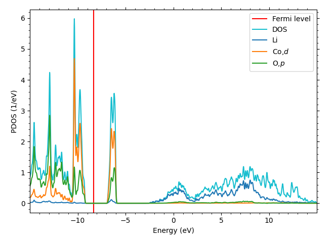 Coのd軌道とOのp軌道がフェルミエネルギー近傍に寄与し、エネルギーギャップを形成していることを示す。非磁性と反強磁性の初期状態の違いによる状態密度の差異を比較し、最終的に非磁性状態に収束することを確認。