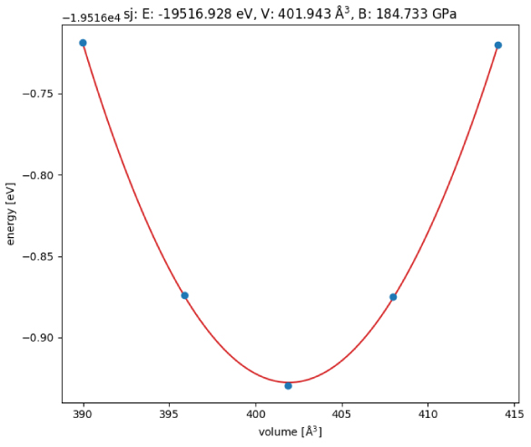 セル長を±1%変化させたときのエネルギー変化から体積弾性率を算出。Voigt法により184.73GPaと評価され、文献値と良好に一致。