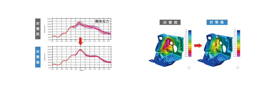 DIFFCRASHは単にばらつきを示すだけでなく、その分析結果を設計改善に活かせる点が大きな強みです。材料特性やスポット溶接の破断閾値などにばらつきを与えて解析し、20サンプル以上の計算結果を比較することで、製造工程で不可避なばらつきを考慮した実用的な設計評価が可能となります。その知見をもとに構造設計を見直すことで、性能の安定性を確保しつつ、過剰な安全マージンに頼らない効率的な設計を実現できます。従来であれば製造段階でのばらつき低減に多大なコストを割いていた部分を、設計段階で吸収する「ロバスト設計」へと転換できるのです。実際の事例では、DIFFCRASHの導入により車体衝突解析の結果ばらつきを大幅に抑制し、製品品質と開発効率の両立を実現しています。