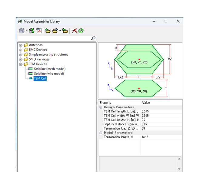 EMCoS Studio には、典型的なアンテナ、フィルタ、装置などのモデルが、ライブラリとして用意されています。TEM cell の装置形状もこのライブラリに標準搭載されており、読み込んで解析に使用することができます。