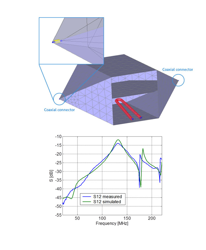 TEM cell 内に同軸ケーブルで接続された回路部品を収めた場合の、放射イミュニティの計算例を示します。グラフは、TEM cell からケーブル終端回路へのノイズの伝達率S21を、実測トシミュレーションで比較したものです。周波数特性がよく一致しており、シミュレーションによって試験を模擬できていることがわかります。