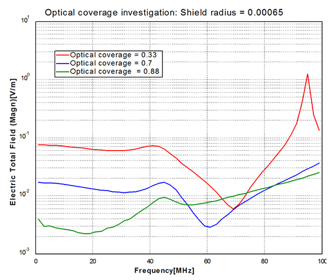 下に示す例は、編組シールドの目の粗さを変えたときの放射電界強度を比較した事例です。