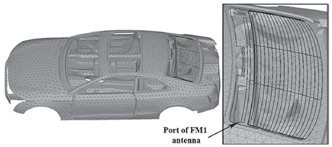 自動車に搭載されるアンテナの数は増加の一途をたどっていますが、アンテナを取り付けられるスペースには限りがあります。この対策の1つとして、窓ガラス上に薄い金属箔をプリントしたアンテナが多用されています。しかしその性能はガラスの誘電体に加えて、同じガラス面上のデフォッガ(曇り取り用の熱線)や別のアンテナパターンの影響を強く受けるため、これを考慮した解析が必要となります。
