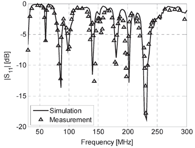 下の例は、複雑なFMラジオ用ガラスアンテナを実際の車体に乗せた状態で給電点のS11(インピーダンス特性)を計算したもので、実際の車体で測定した結果を非常によく再現していることがわかります。