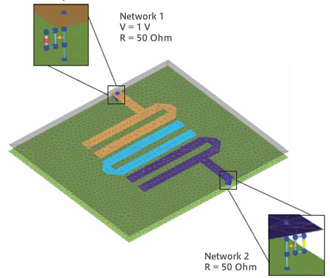 基板上に構成されたマイクロ波帯のバンドパスフィルタを設計し、等価特性を予測することができます。