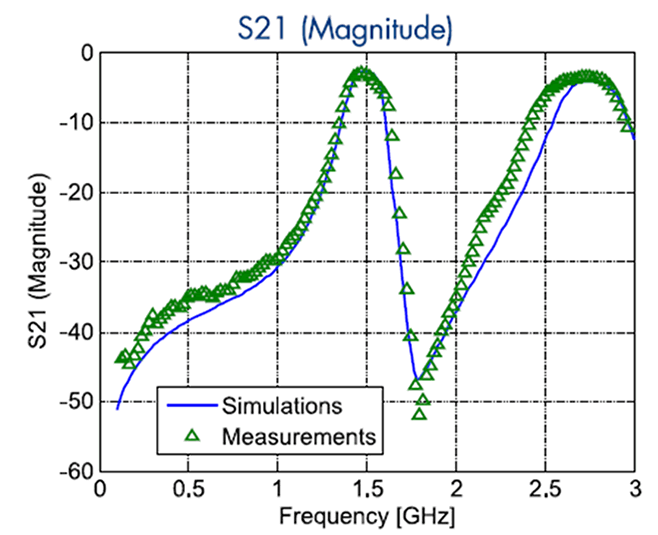 EMCoS Studioでは、こうした基板上のフィルタの金属形状をモデル化することで、フィルタの反射・透過特性を正確に予測することができます。