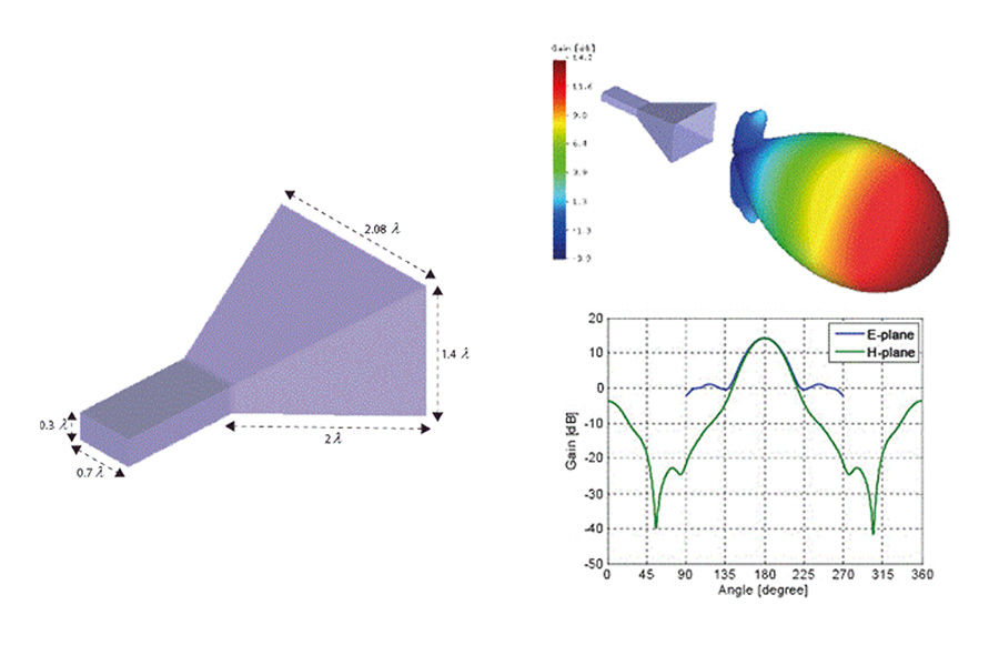ホーンアンテナの寸法、3GHzの指向性、周波数特性