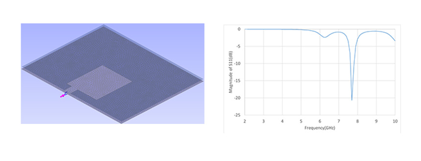 パッチアンテナの解析モデルの外観とSパラメータの結果