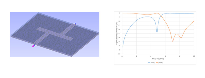 ローパスフィルタの解析モデルの外観とSパラメータの結果