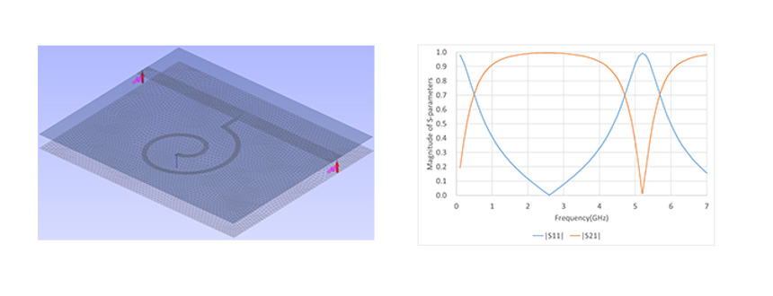 下記は、線路に対して並列に(グラウンドとの間に)らせん状の配線を挿入した、スパイラルインダクタの計算例です。低周波においてインダクタのほうに電流が流れるため S21 が低くなり、また 5GHz 付近で共振により信号が通らなくなる様子がわかります。