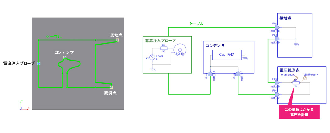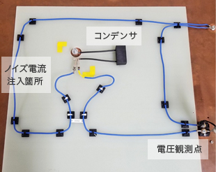ここでは、あるお客様にご協力いただいて実施した実測・計算の比較例を紹介します。まず実測の写真を示します。電流注入プローブでケーブルにノイズ電流を注入し、観測点(電装品の入力端)に到達するノイズ電圧を測定しています。このセットアップで、観測点の手前に取り付けたコンデンサーの種類を変えて、ノイズの違いを比較しました。