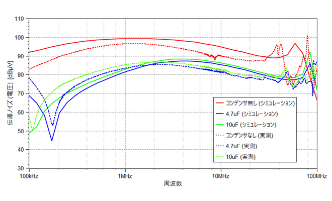 結果:ノイズ対策用コンデンサー違いによる伝導ノイズの差を予測