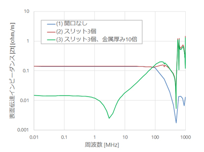 なお、表面伝達インピーダンスが大きいほど、ノイズが漏れやすいことを意味します。この結果から、低周波では電磁界の漏れやすさはスリットの有無によらずコネクターシェルの厚みで決まること、100MHz 程度の高周波になるとスリットからの漏洩が支配的になることなど、興味深い傾向がわかります。