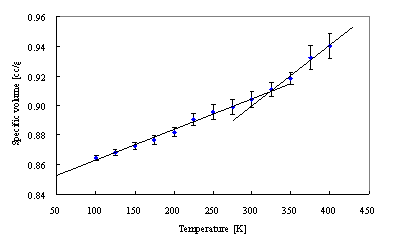 例として、温度変化に伴うポリエチレンの比容積(密度の逆数)の変化を示します。グラフ上で屈曲点が明確に現れており、この時の温度をガラス転移温度として評価します。