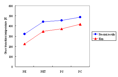 ポリエチレン(PE)、ポリエチレンテレフタラート(PET)、ポリスチレン(PS)、ポリカーボネート(PC)のTgを算出後、実験値と比較しました。実験と比較するとクエンチ速度が高速のため、Tgは高めに評価されていますが、物質の違いによる傾向は実験と一致しており、定性的評価が可能であることが示されています。