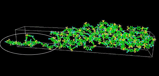 伸長計算の結果、ベンゼン環が伸張方向に垂直に配向するポリスチレン(PS)の構造を示します。ベンゼン環は動きやすいπ電子を含むため、環平面方向の屈折率が高く、環平面に垂直な方向の屈折率は小さくなると考えられています。そのため、ベンゼン環平面が延伸方向に垂直になるポリスチレンでは負の配向複屈折を示すと考えられます。