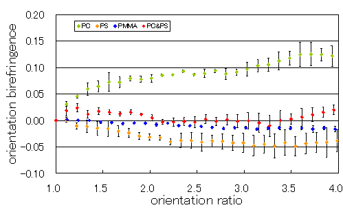 J-OCTAのシナリオ機能を用いて複屈折を評価しました。MDの計算結果から、すべての共有結合のベクトルを得ることができます。それに対して結合分極率データベースを用いて、システム全体でのX・Y・Z各方向の屈折率を評価します。PC、PS、PMMA、PC/PSブレンド系の配向複屈折を比較しました。PCは正、PSは負、PMMAはほぼゼロ、ブレンド系は複屈折が低減される傾向を示しました。