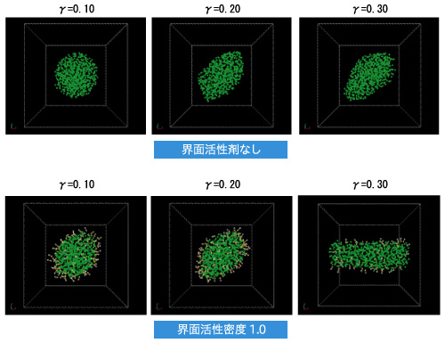 ずり速度γの異なる流れ場での液滴の変形を計算し、比較しました。界面活性剤の有無により界面張力が変化するため、それが変形度の違いに現れています。