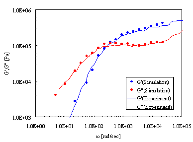 ポリイソプレンのG'とG"をNAPLESで評価した結果を示します。絡み合い高分子のチューブモデルに基づき、絡み合い点間分子量を粗視化ユニットとして計算されています。計算結果は実験値と良好に一致していることが分かります。