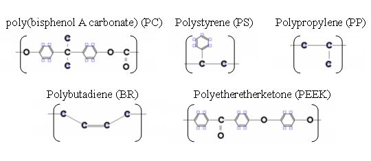 評価対象となった5種類のポリマーの分子構造です。各ポリマーは大きく異なる構造を持ち、物性推算の対象として選定されました。この手法では分子量や分岐鎖の情報は入らず、分子量依存性が無くなるくらい高分子量のポリマーが対象となります。