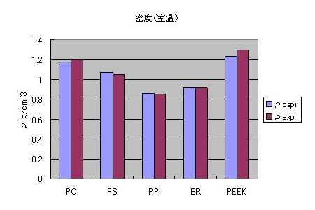 室温における各ポリマーの密度をQSPRで推算し、実験値と比較しました。推算値は実験値と良好な一致を示し、モデルの信頼性を裏付けるものとなっています。