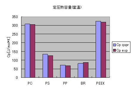 室温における定圧熱容量の、推算結果と実験値の比較です。QSPRによる予測は実験値と高い相関を示しています。