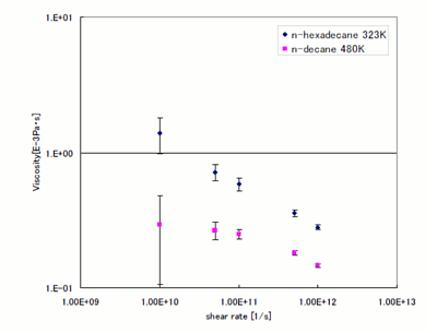 せん断(ずり)速度に対して算出された粘度を両対数でプロットしました。ずり速度の低下と共に粘度が増加しますが、n-decane ではずり速度1e+10[1/s]以下では粘度が一定に近づいていく様子が見えます。文献[1]でのGreen-Kubo 法での粘度の評価では、同条件でのn-decane が0.178[E-3Pa・s]、n-hexadecaneが1.17[E-3Pa・s]となっており、近い傾向が得られています。