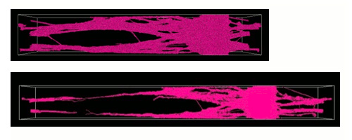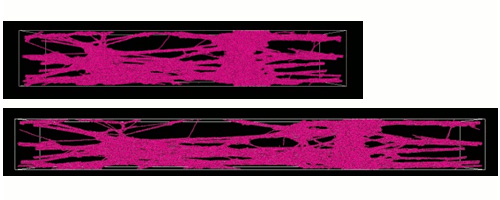 次に、分子量N=512のポリマー鎖におけるクレーズ成長のスナップショットを示します。フィブリルの形成が進行し、より複雑な構造が見られます。分子量の違いによる構造形成の違いが明確に示されています。