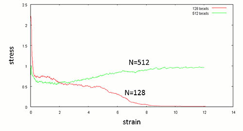 N=128のケースでは降伏後に応力が低下しますが、N=512のケースではフィブリル形成後に応力が上昇する傾向が見られています。分子量の違いが力学的応答に与える影響を定性的に評価することが出来ました。