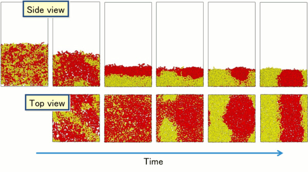 初期状態では溶媒により混合していたポリマー2成分が、蒸発に伴いまず基板に平行な相分離構造を形成し、最終的には基板に垂直な構造へと変化する様子が捉えられています。