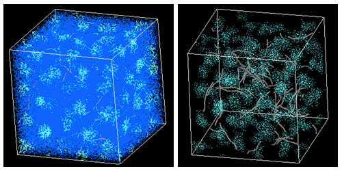 DPDを用いてジブロック共重合体の相分離とカーボンナノチューブ(CNT)の分散構造を計算しました。CNTは一つの成分と親和性が高くなるように設定され、剛直性を持たせたモデルで分散挙動を解析しました。