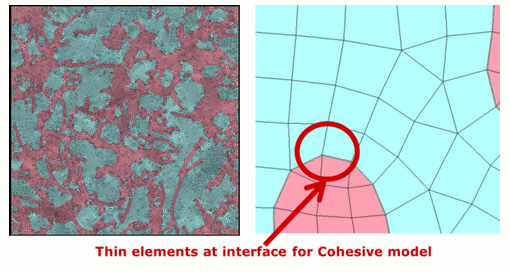 DPDの計算結果をもとにCNTとポリマーの分散構造を2Dメッシュ化しました。界面に薄い要素(Cohesive要素)を設定し、FEM解析で界面パラメータを調整可能にしました。