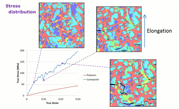 Ansys LS-DYNAを用いた非線形有限要素法(構造解析)による一軸伸長解析を実施して、界面剥離や応力伝搬の様子を捉え、CNTの分散構造が応力-ひずみ特性に与える影響を明らかにしました。