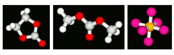 EC、DMC、PF6の代表的な分子構造をJ-OCTAでモデル化。COGNACモデラーにより、点電荷を含む力場パラメータの設定・調整が可能で、電解液向けの力場も取り入れることが可能です。