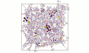 バルク状態において、黄色い粒子で示されているLi+イオンの挙動を分子動力学を用いた長時間緩和計算により解析します。自己拡散係数や電解液成分の構成比が拡散に与える影響を評価可能です。