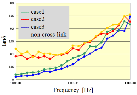 異なる架橋構造(case1〜case3)におけるtanδの周波数依存性が示されています。末端架橋構造では低周波数領域でtanδが低く、転がり抵抗の低減に寄与することが示唆されています。