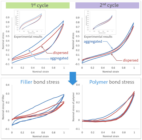 1サイクル目と2サイクル目の応力-ひずみ曲線(Stress-Strainカーブ)が示されており、フィラーの分布がマクロな力学応答に影響を与えていることが分かります。