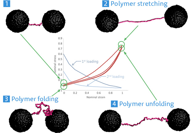 引張・除荷時のフィラー間のポリマー鎖が示されています。1回目の引張時にフィラー間をつないでいるポリマーが引き出されて、除荷後の2回目の引張時に応力軟化を生じさせる原因となる様子が視覚的に確認できます。