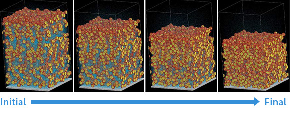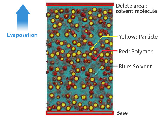 VSOPを用いてスラリー中の溶媒蒸発プロセスをシミュレーションした結果が示されています。蒸発に伴い粒子やポリマーの配置が変化し、最終的な構造形成に影響を与えます。