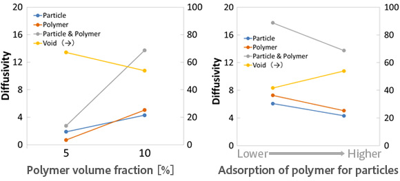 【結果】多孔質構造の拡散性能/伝導性能(Muffin)(左)ポリマー体積分率の影響、(右)吸着性能の影響
