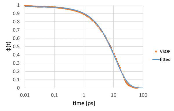 VSOPによる水の誘電緩和関数が示されています。分極の自己相関関数から誘電緩和関数を評価し、デバイ型関数でフィッティングすることで緩和時間τを算出しました。