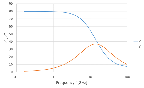 緩和時間τと静的誘電率ε(0)、高周波誘電率ε(∞)を用いて、GHz領域での水の誘電分散(複素誘電率)を評価した結果が示されています。