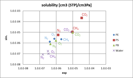 計算された溶解度係数と実験値との比較が示されています。PSへの溶解度が高く、CO₂分子は他のガスよりも高い溶解度を示す傾向が確認されました。